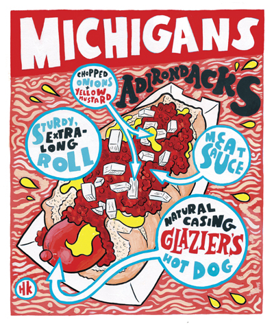 TRAVELING ALONG THE Champlain Valley or across the northern Adirondacks, there’s no quicker way to stamp “outsider” on your forehead than to saunter up to a screened takeout window and ask for a chili dog. If you’re craving a spicy condiment around these parts, you’d best order a michigan. Better still, ask for one “with, buried” (code for onions tucked under the sauce or dog) and you’ll be taken as a bona fide native.