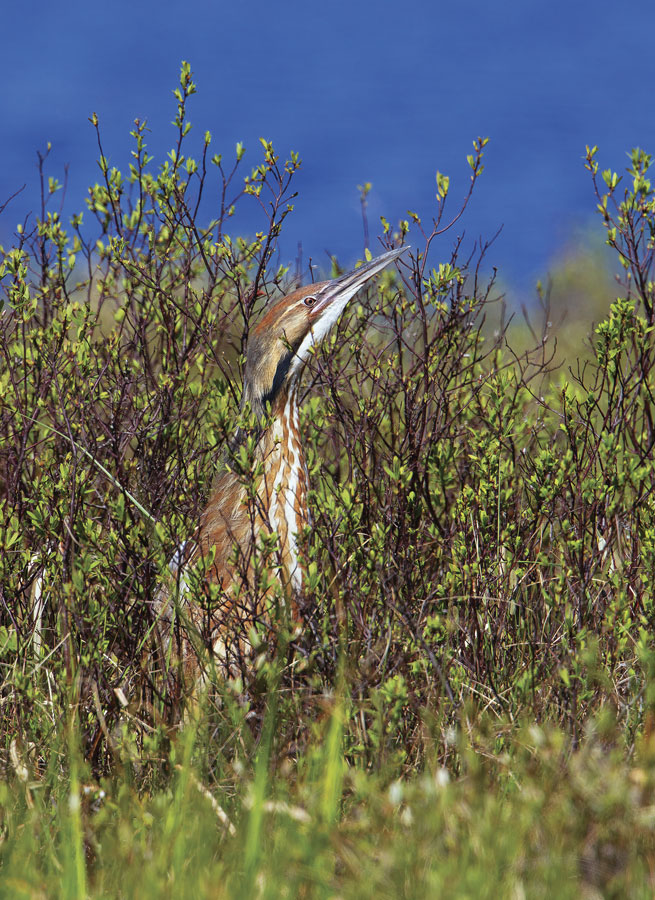 Dense freshwater marshes, sedges, reeds and wet meadows and bogs with tall grasses are breeding habitats for this large, solitary heron. Usually difficult to spot, it is occasionally seen in the open in late mornings and early afternoons. When alarmed, the bittern extends its neck and head vertically and freezes or sways with the breeze, blending in with surrounding vegetation. Diet is mostly fish and other aquatic life. Known for its odd song—oonk-GA-loonk—that can be heard across long distances. Winters in the southern US, Mexico and Bermuda.