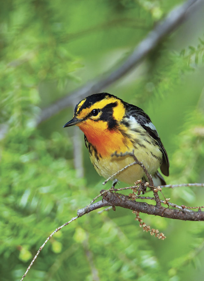 A small migrant songbird that breeds in mature conifer and mixed forests. The male in breeding plumage sports a bright orange throat with contrasting black markings. In spring and summer, they sometimes feed on the underside of vegetation by hovering and working their way outward along branches, starting at the base and moving to the tip. Caterpillars, beetles, spiders and other small insects are their main diet. The male has two primary songs. One begins with a short series of three high notes followed by a lower-pitched series of four or five notes—teetsa teetsa teetsa zizizizizi. The other begins low and ends high; the first part of the song is a series of rapid two-part notes followed by one or two high notes—zip zip zip titi tseeeeee. Blackburnians spend the winter in the mountain forests of southern Central America and northern South America.