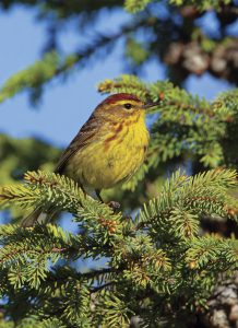 A woodland warbler that breeds in northern sphagnum bogs with scattered cedar, tamarack and black spruce trees. An early nester, arriving in April. Near the base of a stunted spruce at the edge of a bog, the female will create an open cup nest. It feeds mostly on small beetles, mosquitoes, flies, caterpillars, aphids, grasshoppers, ants, bees and spiders. Its voice is a weak dry trill, like that of chipping sparrow but slower—tre-tre-tre-tre-tre-tre! Palm warblers spend the winter in the southeastern US, especially Florida, and the Caribbean.