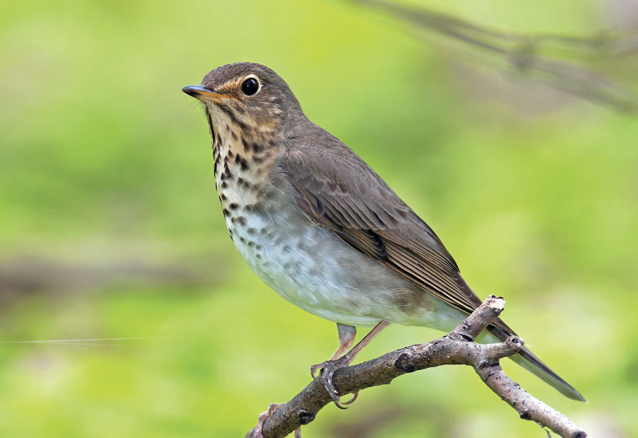 A wary migrant songbird that prefers edges and openings of coniferous and mixed woods. Although Swainson’s thrush may be seen occasionally standing or running on the forest floor, this species spends less time on the ground than other thrushes. Likewise, they feed not only on the ground but forage in trees and may hover momentarily to take insects from foliage or catch them in midair. Their song is a series of reedy spiraling notes inflected upward—oh, Aurelia will-ya, will-ya will-yeee. Winters in Central and South America.
