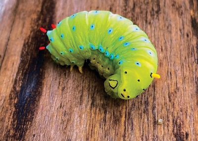 The caterpillar had such vibrant colors that stuck out on a cloudy and rainy day.