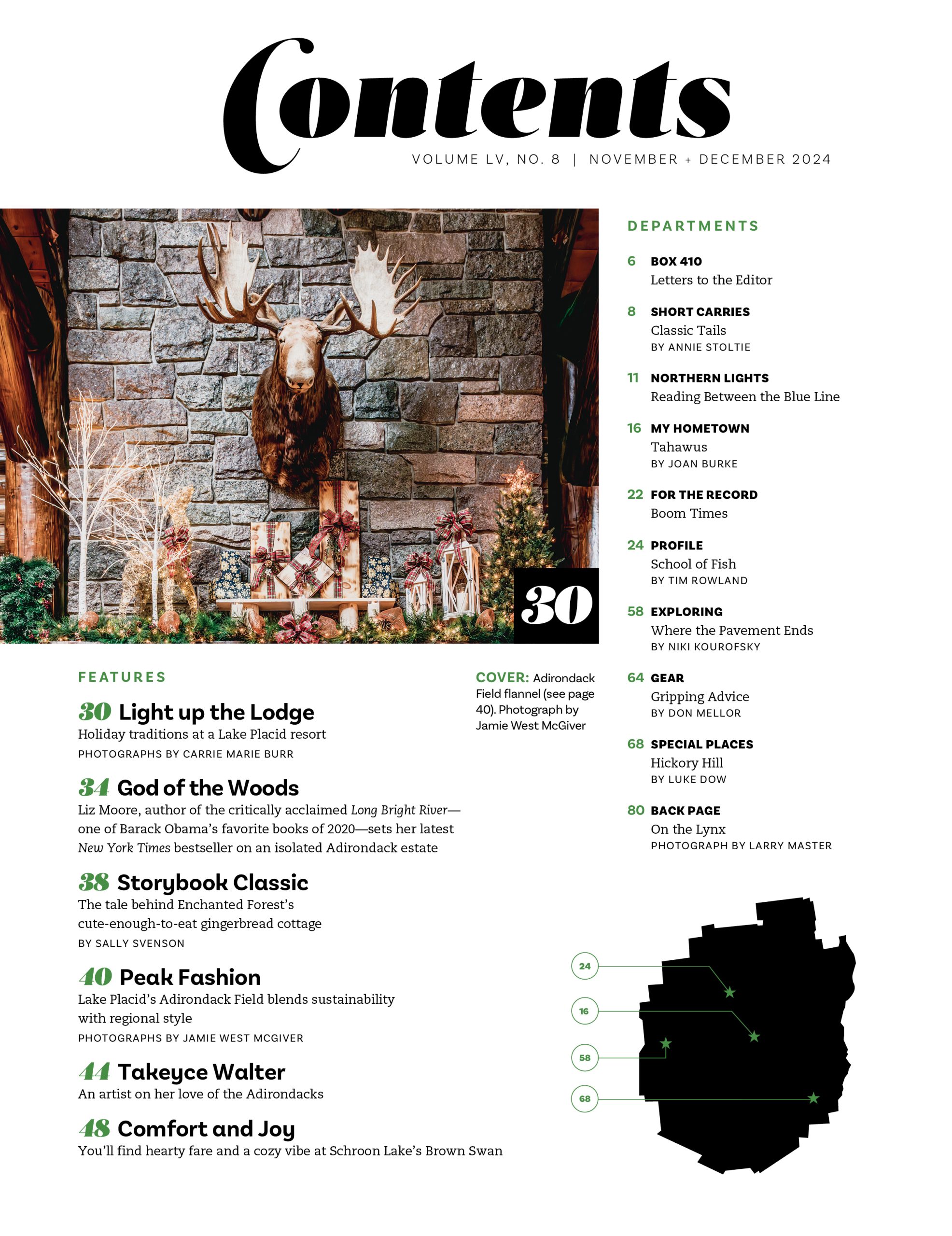 “The place is magical during the holidays,” says the Whiteface Lodge’s executive chef Greg Sherman. Festive garlands and twinkling lights dangle from peeled-log beams; miniature mountain villages depict wintry scenes; and shiny wrapped packages ring Christmas trees and are stacked on fireplace mantels.